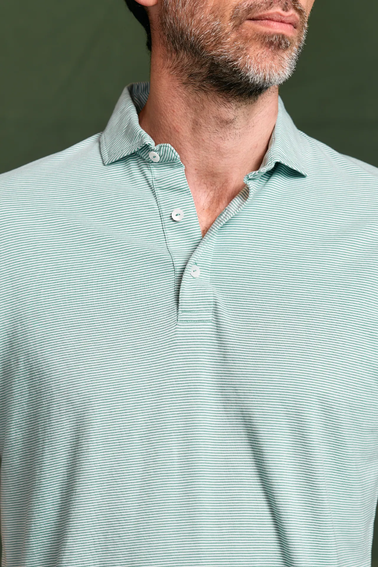 A timeless polo designed for comfort, versatility, and everyday polish. This light blue striped polo features a refined micro-stripe pattern that delivers a classic look with a modern edge. Crafted from a lightweight, breathable performance fabric, it offers moisture-wicking comfort and easy stretch for all-day wear. Finished with a structured collar, two-button placket, and a relaxed yet tailored fit, this polo transitions seamlessly from the golf course to casual Fridays or weekend outings.